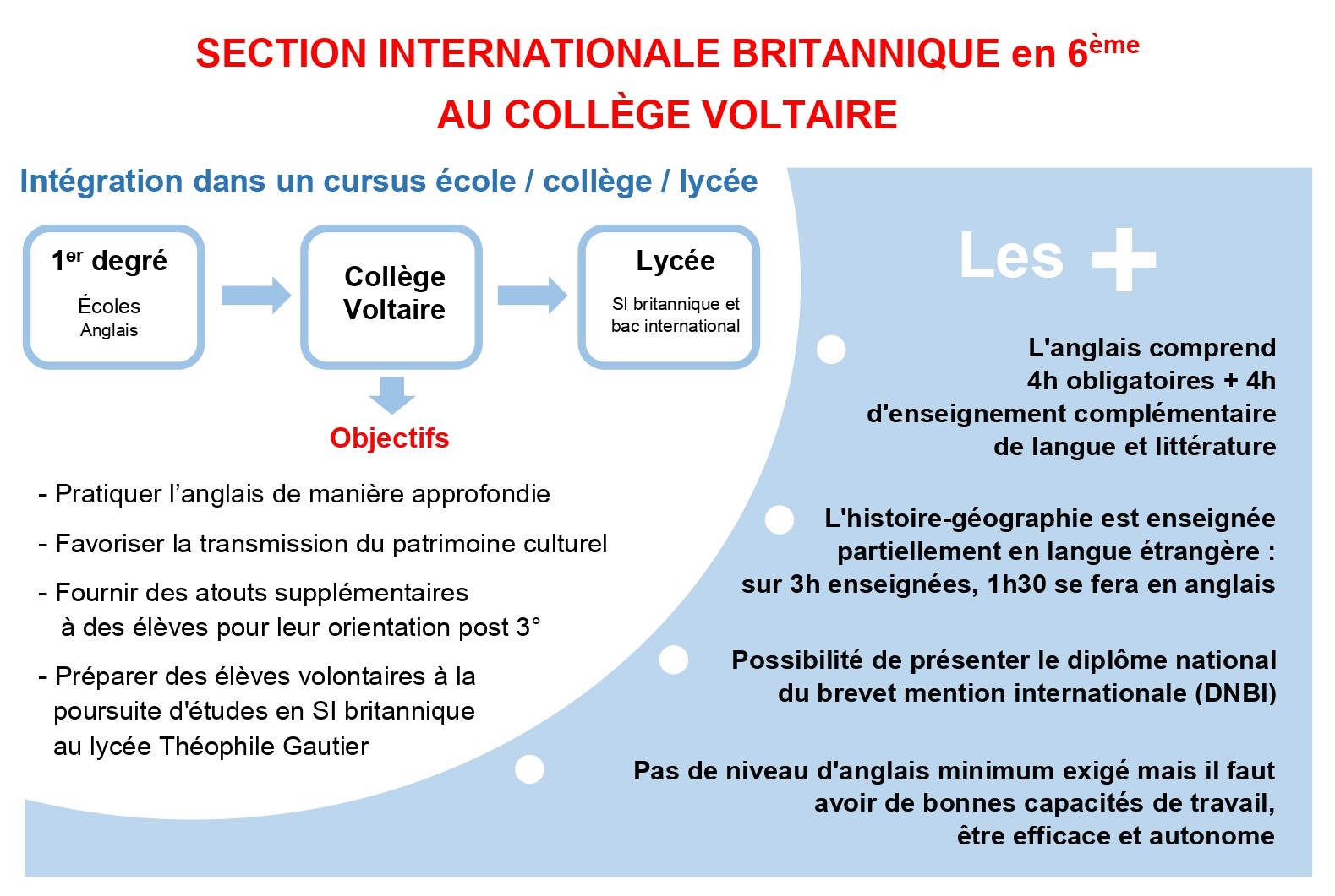 - Préparation aux études en SI britannique : Les élèves volontaires seront préparés à poursuivre leurs études en section internationale britannique au lycée Théophile Gautier.